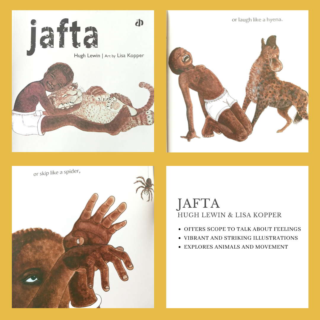 No, children's books don't need to be bursting with colour, and to be honest, it's really the art that drew us to Jafta. Centred around a child's varied feelings and moods, the illustrations—done in a limited colour palette—are striking, with a wonderful sense of movement.