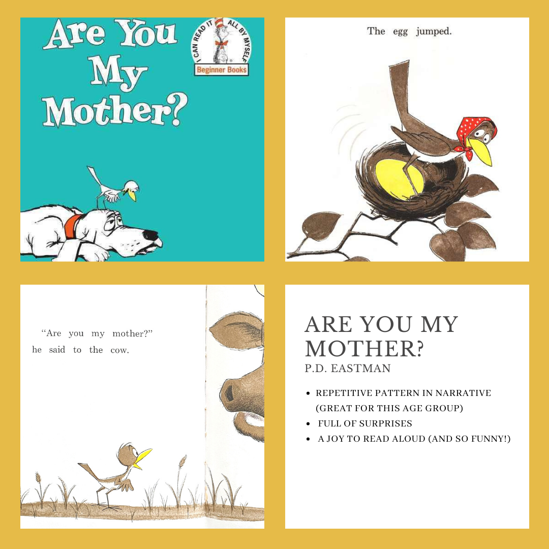 A hatchling hatches out of its egg when the mother bird is away, and goes in search of her. Unsure of what her mother looks like, she asks a series of creatures—a cat, a dog, a cow—if they are her mother before moving on to increasingly bizarre things: planes, boats and a giant power shovel. Even after multiple repeat reads, this one doesn't get old.